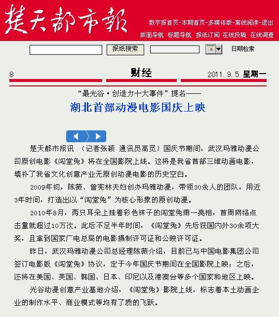 2009年初,陳薇、曾憲林夫婦創(chuàng)辦瑪雅動(dòng)漫,帶領(lǐng)30余人的團(tuán)隊(duì),用近3年時(shí)間,打造出以“闖堂兔”為核心形象的原創(chuàng)動(dòng)漫。