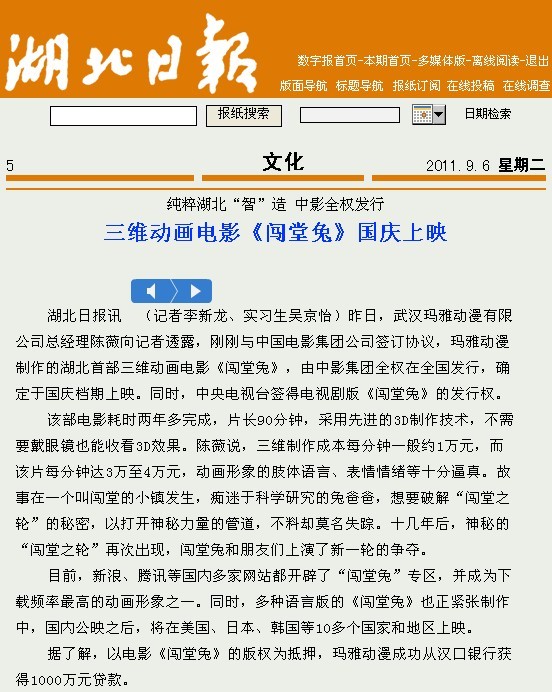 湖北日?qǐng)?bào)訊??(記者李新龍、實(shí)習(xí)生吳京怡)昨日,武漢瑪雅動(dòng)漫有限公司總經(jīng)理陳薇向記者透露,剛剛與中國電影集團(tuán)公司簽訂協(xié)議,瑪雅動(dòng)漫制作的湖北首部三維動(dòng)畫電影《闖堂兔》,由中影集團(tuán)全權(quán)在全國發(fā)行,確定于國慶檔期上映。同時(shí),中央電視臺(tái)簽得電視劇版《闖堂兔》的發(fā)行權(quán)。