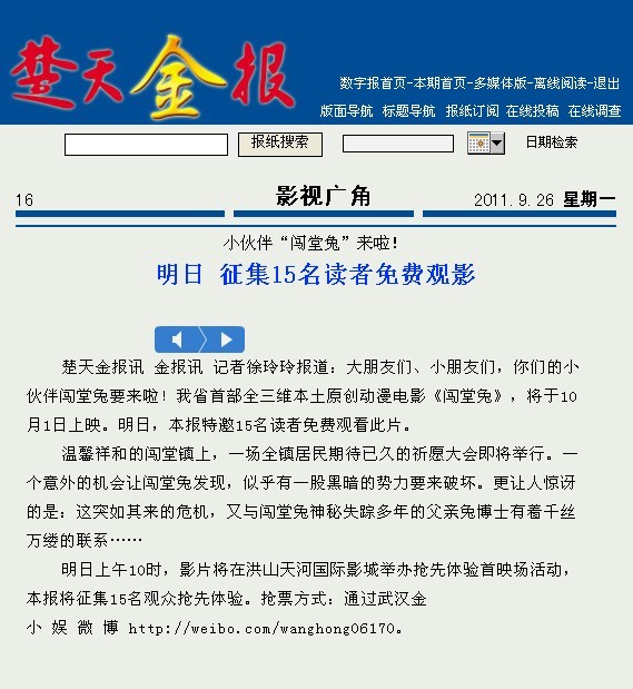 ? 楚天金報訊?金報訊?記者徐玲玲報道:大朋友們、小朋友們,你們的小伙伴闖堂兔要來啦!我省首部全三維本土原創(chuàng)動漫電影《闖堂兔》,將于10月1日上映。明日,本報特邀15名讀者免費(fèi)觀看此片。