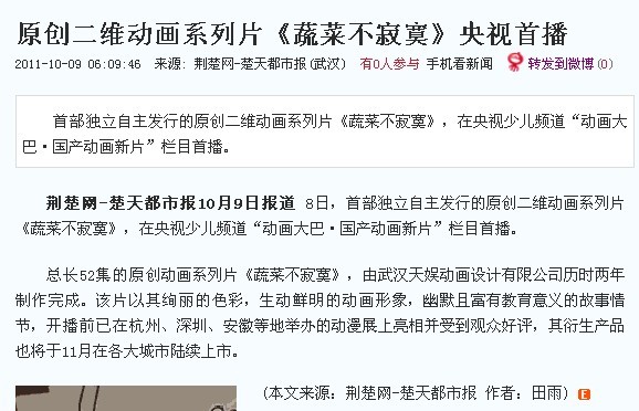??????8日,首部獨(dú)立自主發(fā)行的原創(chuàng)二維動(dòng)畫系列片《蔬菜不寂寞》,在央視少兒頻道“動(dòng)畫大巴·國產(chǎn)動(dòng)畫新片”欄目首播。