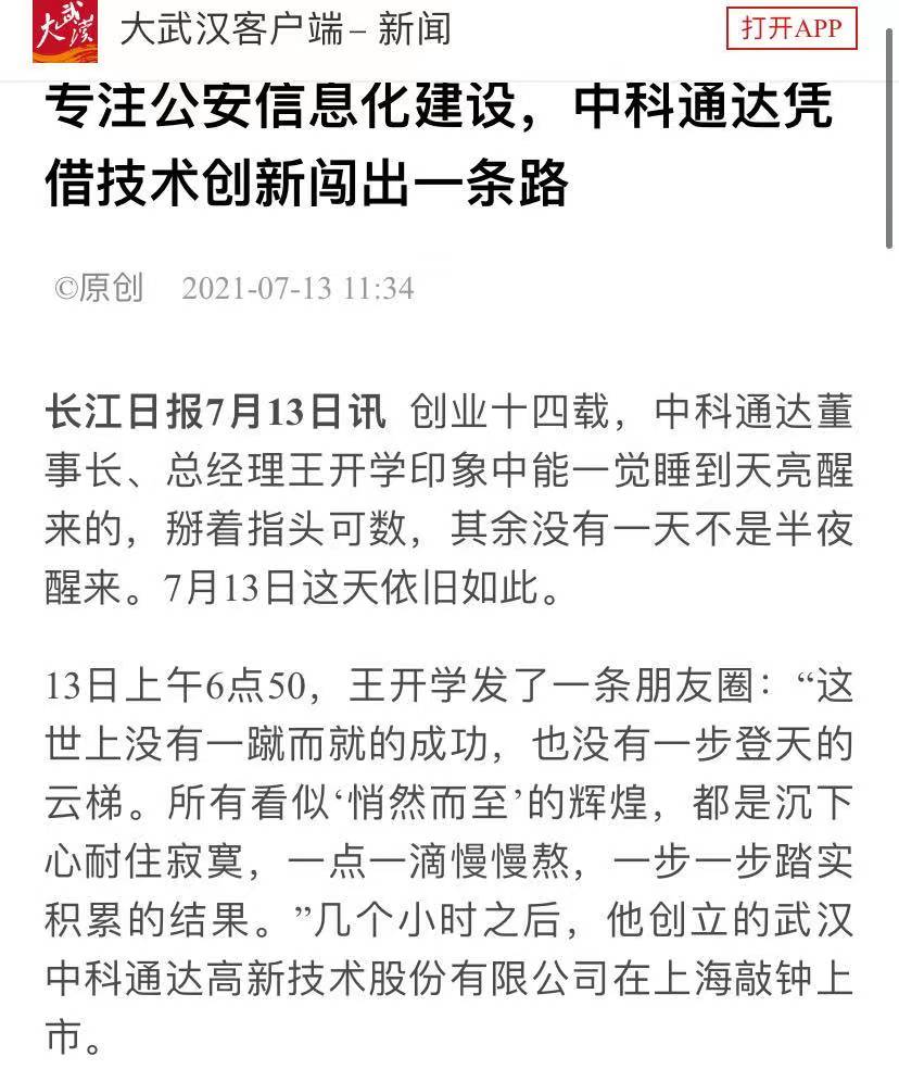13日上午6點(diǎn)50,王開學(xué)發(fā)了一條朋友圈:“這世上沒有一蹴而就的成功,也沒有一步登天的云梯。所有看似‘悄然而至’的輝煌,都是沉下心耐住寂寞,一點(diǎn)一滴慢慢熬,一步一步踏實(shí)積累的結(jié)果?!睅讉€小時(shí)之后,他創(chuàng)立的武漢中科通達(dá)高新技術(shù)股份有限公司在上海敲鐘上市。