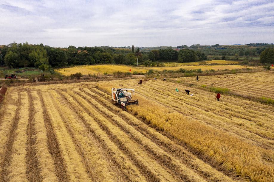 At a village in Wuhan, Hubei province, work began on Wednesday to harvest more than 20 hectares of rice grown from seeds that traveled into space. [Photo provided to chinadaily.com.cn]