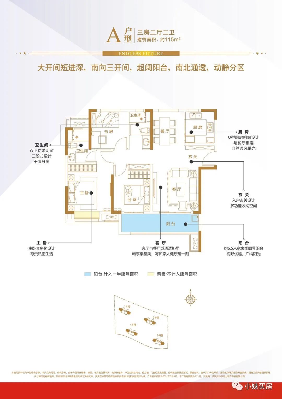 ? ? ? 建面約115平戶型:主臥套間設(shè)計(jì),而且一線貫穿,空間比較闊綽,主臥套房設(shè)計(jì),帶獨(dú)立衛(wèi)生間,私密性更好??蛷d與南向次臥連接一個(gè)約6.5米景觀大陽(yáng)臺(tái),觀景、晾曬、采光都比較不錯(cuò),可滿足三代同堂居住需求!